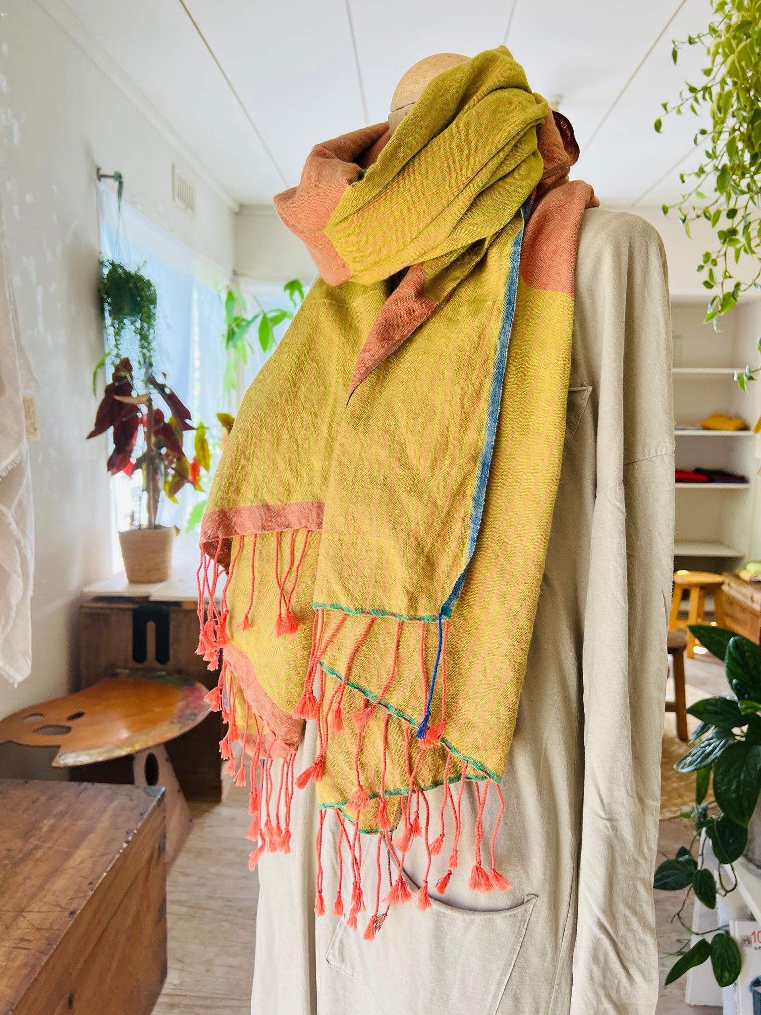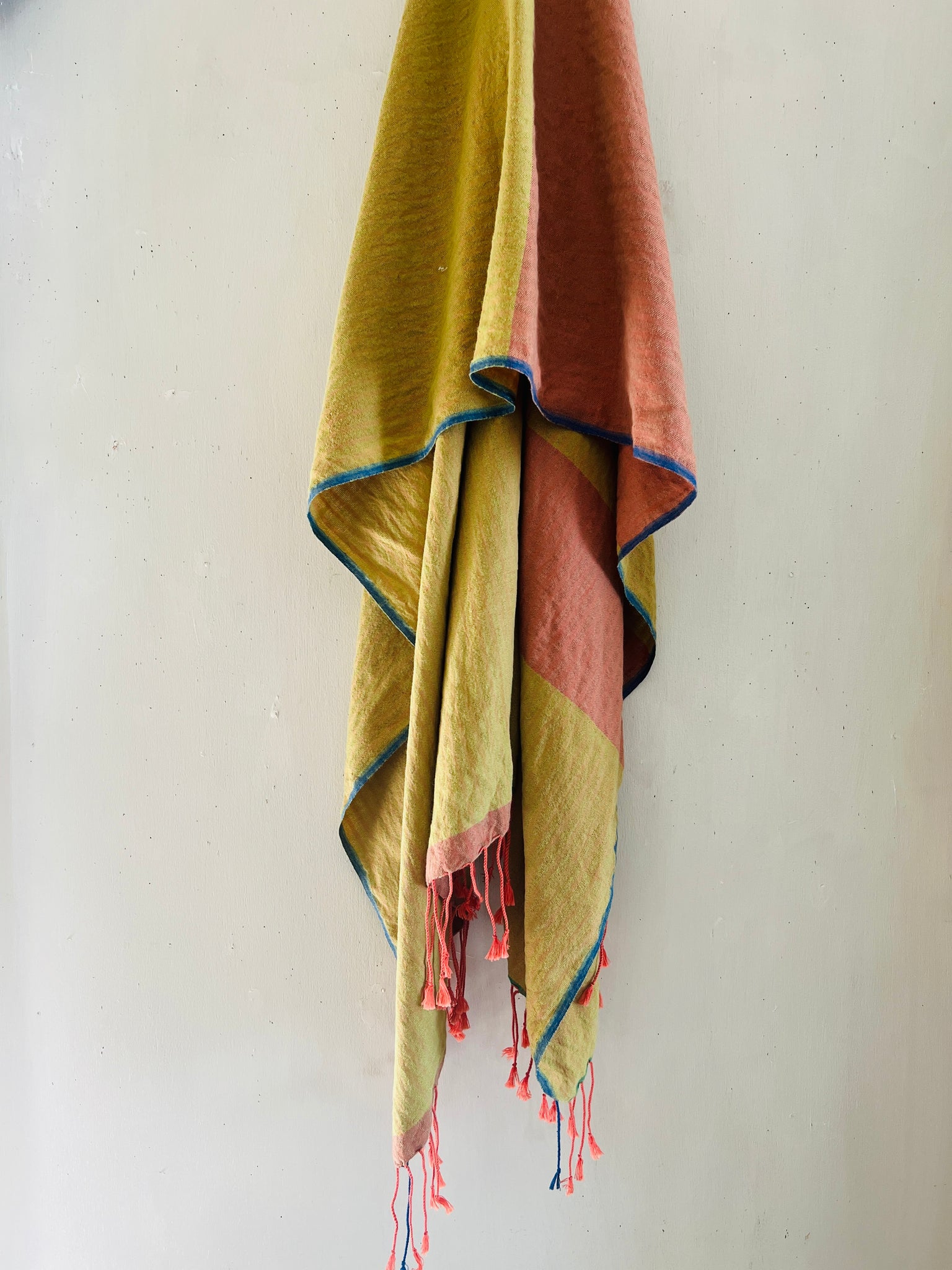 こっくりと鮮やかなパーシモン=柿色の経糸が美しい、2025年新作クロマー。織り上がりからふわりとやわらかでふっくらした独特の質感が特徴です。ポイントカラーになっている 片脇のブルーのラインは手紡ぎ糸を使用。
